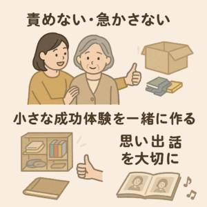 一緒に仕分けをしたり、思い出の品を丁寧に扱ったりすることが、家族の関係を壊すことなく整理を進めるお手伝いになるのです。